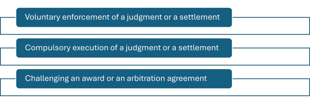 The issuance of an award by arbitrators or the conclusion of a settlement before them may lead to (1) voluntary execution of the judgment/settlement by the losing party (in whole or in part regarding the claim pursued by the opponent), (2) compulsory enforcement of a claim that has been recognized by arbitrators in an award or settlement.